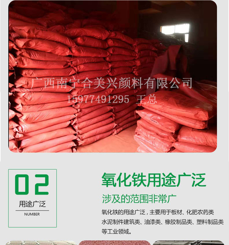 氧化鐵顏料主要用于建筑結構,水泥制件的著色,各種室內外的建筑表面,如墻面、地坪、天花板、支柱、廳廊、階梯、路面、停車場、車站等,2.各種建筑材料,如磚、面磚、地磚、屋瓦、彩色路面,彩色地磚,建筑材料,嵌板、水槽、水磨石、馬賽克花磚、人造大理石、石棉水泥板等。3,油漆、涂料和噴漆的著色和防銹:適用于各種涂料、油漆著色,可用于涂料油漆中底漆、膩子、面漆的著色。4,廣泛用于建筑模板,涂料油漆,橡膠,塑料等著色,顏色穩定,顏色鮮艷,著色力強。
